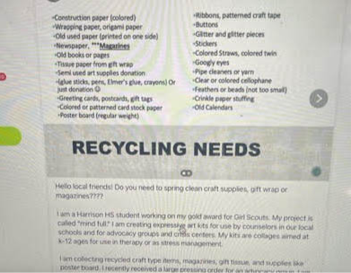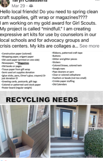 Our recycle drive began in mid March to raise supplies for our collage kits by May. We placed a recycle box at a local church in the preschool department and advertised through signs. A local community driven drive was announced in Facebook and Next Door with an overwhelming response. A further box was placed at my high school in several classroom environments with signage throughout the school. A middle school also participated in collecting supplies. Each box had 2 signs. One informed about the program, the other with supply needs in list format. The recycling boxes final collection is slated for the end of the first week of May to allow additional sorting.