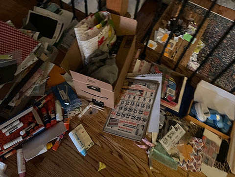 Here are few images of the mess we had to sort through since donations were coming in fast. Note that the table downstairs in the picture above was a cutting station